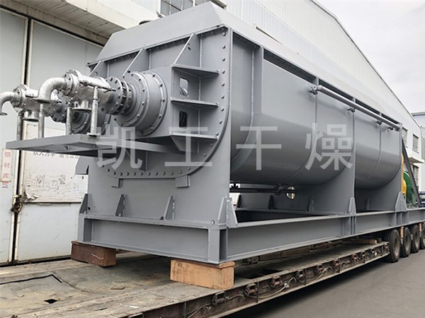 空心軸上密集排列著楔型中空漿葉,熱介質(zhì)經(jīng)空心軸流經(jīng)漿葉。單位有效容積內(nèi)傳熱面積很大,熱介質(zhì)溫度從-40℃到320℃,可以是水蒸汽,也可以是液體型:如熱水、導(dǎo)熱油等。間接傳導(dǎo)加熱,沒有攜帶空氣帶走熱量,熱量均用來加熱物料。熱量損失僅為通過器體保溫層向環(huán)境的散熱。楔型漿葉傳熱面具有自清潔功能。物料顆粒與楔型面的相對(duì)運(yùn)動(dòng)產(chǎn)生洗刷作用,能夠洗刷掉楔型面上附著物料,使運(yùn)轉(zhuǎn)中一直保持著清潔的傳熱面。漿葉干燥機(jī)的殼體為Ω型,殼體內(nèi)一般安排二到四根空心攪拌軸。殼體有密封端蓋與上蓋,防止物料粉塵外泄而充分發(fā)揮作用。