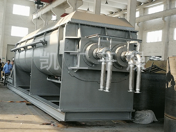 空心軸上密集排列著楔型中空漿葉,熱介質經空心軸流經漿葉。單位有效容積內傳熱面積很大,熱介質溫度從-40℃到320℃,可以是水蒸汽,也可以是液體型:如熱水、導熱油等。間接傳導加熱,沒有攜帶空氣帶走熱量,熱量均用來加熱物料。熱量損失僅為通過器體保溫層向環境的散熱。楔型漿葉傳熱面具有自清潔功能。物料顆粒與楔型面的相對運動產生洗刷作用,能夠洗刷掉楔型面上附著物料,使運轉中一直保持著清潔的傳熱面。漿葉干燥機的殼體為Ω型,殼體內一般安排二到四根空心攪拌軸。殼體有密封端蓋與上蓋,防止物料粉塵外泄而充分發揮作用。