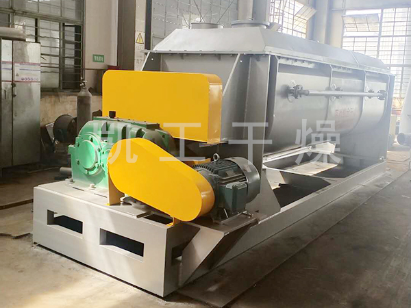 印染污泥干燥機是一種以熱傳導為主的臥式攪拌型干燥機。設備干燥時所需熱量是依靠熱傳導間接加熱,因此干燥過程只需少量的氣體以帶走濕分,這就極大地減少了被氣體帶走的這部分熱量的損耗,提高了熱量的利用率,整個干燥過程在封閉狀態下進行,有機揮發氣體及異味氣體在密封氛圍下送至尾氣處理裝置,避免環境污染,所以該設備是一種環保節能型干燥設備,并已得到環保部門的認可。